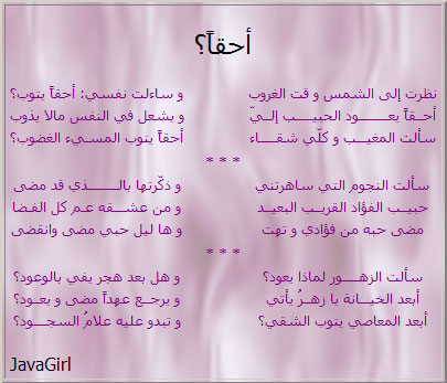هذه التدوينة ادرجت بتاريخ 23 يناير 2002 في الساعة 10:55 م ضمن تصنيف شخابيط شعرية. يمكنك متابعة أي تعليق من خلال RSS 2.0 خلاصات التعليقات. يمكنك ترك تعليق, أو تعقيب من خلال موقعك الشخصي.